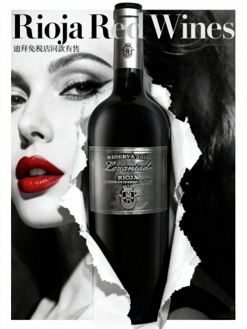 撕纸风拼贴,黑白光影中红唇与酒瓶交织,金属质感标签凸显奢华,杂志风封面尽显时尚优雅。