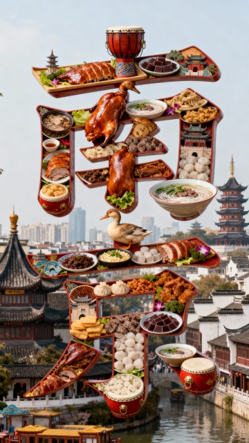 国潮风大字“南京”由中式美食拼贴而成,融合重拟物与超现实主义,展现喜庆复古的节日氛围。