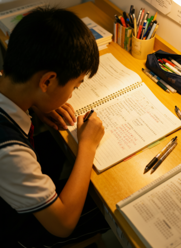 东亚风实景感画面,柔和光影洒落,孩童专注书写,手账风与水彩质感交织,营造温馨舒适、清新质朴的居家学习氛围。