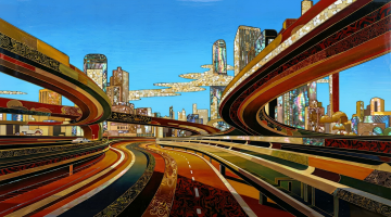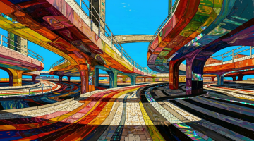 一条宽阔延伸的沥青道路,路面呈现出细腻的横向纹理和中间醒目的白色分隔线,道路尽头是现代化的城市天际线,高楼林立,远处有一片平静的水域,天空中飘着几朵白云,整体画面采用极简主义的插画风格,线条流畅,色彩以灰蓝色调为主,营造出宁静而开阔的氛围,具有强烈的设计感和空间感。