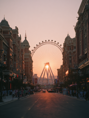 上海陆家嘴金融中心的航拍全景,标志性建筑群包括东方明珠电视塔、上海中心大厦、环球金融中心和金茂大厦,建筑群在日落时分被温暖的橙粉色霞光与深蓝渐变的天空映照,建筑物玻璃幕墙反射着天空的色彩,黄浦江蜿蜒流过城市,水面上有船只驶过留下的波纹和灯光倒影,岸边的道路和建筑灯光已点亮,形成璀璨的城市夜景与黄昏天空的过渡效果,整体呈现出现代、繁华、大气的都市氛围,画面构图采用广阔的远景视角,展现城市的宏伟规模和天际线轮廓,色彩以蓝色、紫色、橙色为主色调,光影对比鲜明,细节丰富,具有高度写实的摄影质感和高清画质。