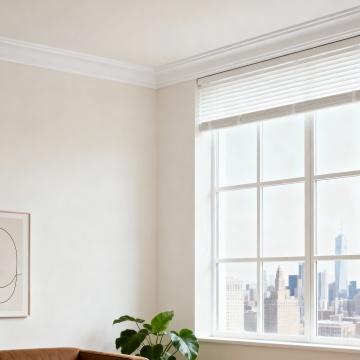 现代简约风格的室内角落图,核心元素是石膏线吊顶 + 百叶窗 + 极简装饰,整体呈现干净、高级的视觉效果: