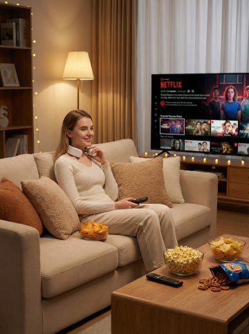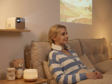 居家观影场景:白人女性沙发靠枕上佩戴,投影幕布/爆米花桶/毛毯,暖光氛围突出放松