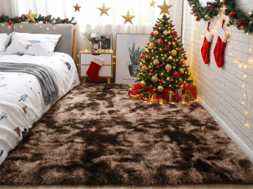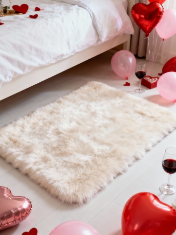 放在米白色毛绒毯上的瓶身有精致刺绣文字与图案(点缀雪花装饰),背景为台灯、积雪圣诞树摆件。