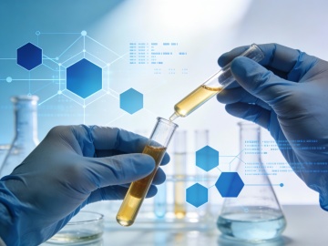俯视角构图,极简主义实验室工作台面中央,一只戴着无菌白色丁腈手套的手正以毫米级精度操控着一支尖端极细的石英微量移液器,透明的液体弯月面在吸头末端形成完美的半球体,正悬停在一支刻有金色刻度线的硼硅酸盐玻璃试管正上方2毫米处,试管内装有三分之二体积的淡蓝色荧光溶液,底部沉淀着细密如星尘的白色颗粒,周围环绕着五只排列成正六边形的相同试管,每只试管内液体呈现出从浅蓝到靛蓝的渐变层次,背景是被柔和白光均匀照亮的浅灰色环氧树脂台面,左侧放置着一个带有蓝色LED指示灯的小型离心机,右侧是半开的磨砂玻璃试剂瓶,整个画面采用高对比度的蓝白灰三色系统,8K超高清分辨率捕捉到手套纹理和液体表面张力的微妙变化,浅景深使所有元素聚焦于移液动作的黄金分割点,营造出冷静、精准、近乎仪式感的科学美学。