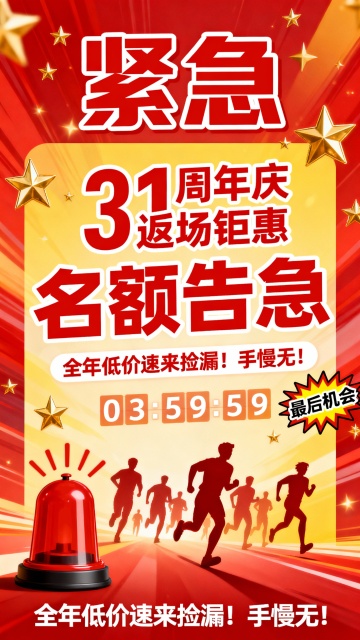 标题“钜惠名额急速下降中” 中间“速抢”突出 下面三个按钮分别是“返场钜惠”“名额紧张”“额满即止” 红色调 紧张的氛围