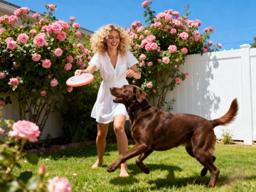 美式庭院场景,中央放置小宠围栏,围栏内几只兔子正在玩耍,背景是美式风格的建筑物并适当虚化,庭院中有草坪、花卉和休闲桌椅,阳光明媚,整体氛围温馨自然
