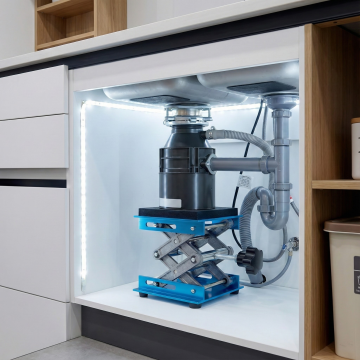 3D渲染风格的现代厨房水槽特写,不锈钢材质水槽搭配银色金属水龙头,白色台面与深灰色橱柜形成简洁对比,木质地板增添自然质感,柔和自然光从上方照射形成清晰光影层次,高光表现金属的光滑质感,整体呈现简约、干净、高级的家居氛围,不同角度展示水龙头与水槽的现代设计细节。