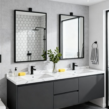 现代简约家居风格的亚马逊主图,明亮洁净的浴室场景,3/4侧面中央放置黑色纹理金属置物架。顶层挂2-3条蓬松大浴巾和小毯子,中层叠放整齐毛巾,下层放置2个5加仑水桶,侧面挂钩挂衣物刷。置物架底部轮子清晰可见,其中一个微微离地。金属杆和轮子上有微小水珠特效,突出防潮防锈特性。背景为浅灰色瓷砖墙和白色洗手台,整体光线明亮柔和,突出产品高端质感与实用功能。