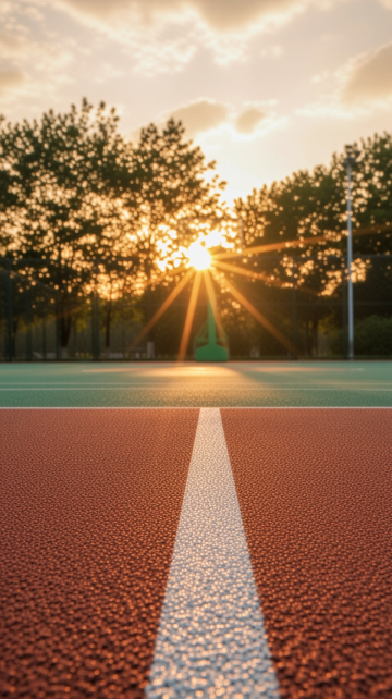 广角镜头,雨后清晨的中学校园,湿润的红色塑胶跑道在朝阳下泛着珍珠般的光泽,跑道线被雨水冲刷得格外洁白醒目,跑道两侧的青草叶尖垂着晶莹的露珠,远处的教学楼玻璃幕墙反射着初升的金色阳光,看台上散落着几把彩色雨伞,天空是洗练过的湛蓝,大朵的积雨云边缘镶着金边,空气中弥漫着青草与湿润泥土的清新气息,整个画面呈现出雨后特有的通透感和蓬勃的生命力。