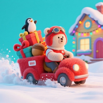 软3D风拟人企鹅戴圣诞帽驾雪橇,载满礼物穿梭雪景,玻璃质感雪橇与糖果点缀,营造梦幻温馨的节日氛围。