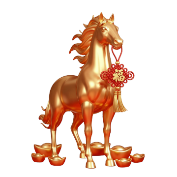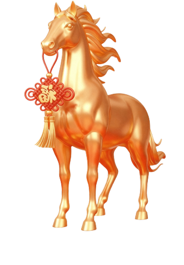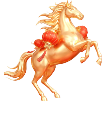 一匹姿态昂扬的骏马,身披红色绸缎,鬃毛和尾巴飘逸,马蹄踏在金色祥云上,周围环绕着红灯笼、中国结和金色烟花,背景是淡红色渐变,整体风格喜庆吉祥,充满新年氛围