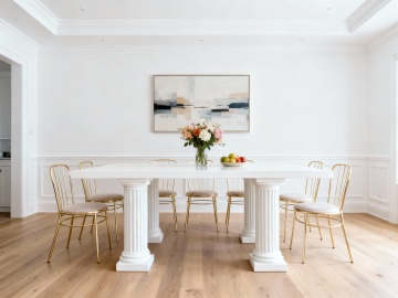 一个明亮整洁的现代厨房,采用简约优雅的设计风格,以白色为主色调,搭配黄铜色金属装饰细节。厨房整体呈现出温馨舒适的氛围,阳光透过百叶窗洒入,在白色橱柜和大理石台面上形成柔和的光影效果。白色的橱柜带有黄铜色的圆形拉手,上方的吊柜和下方的地柜组合提供了充足的储物空间。大理石台面光滑洁净,带有自然的灰色纹理。台面上有一个双槽不锈钢水槽,搭配黄铜色的水龙头。水槽旁边的金属桶里插着木质的锅铲和汤勺。墙面安装着黄铜色的挂杆,上面挂着各种木质和金属材质的厨房用具,包括勺子、铲子等。挂杆上方的白色搁板上摆放着不锈钢和玻璃材质的储物罐,里面装着各种香料和食材。台面上还摆放着一个白色的盘子,里面放着几块叠在一起的三明治,旁边还有一盘色彩鲜艳的沙拉。整体构图采用了三分法,光线从左侧窗户进入,营造出明亮通透的感觉,细节丰富,质感细腻,展现出干净利落的现代厨房设计感。