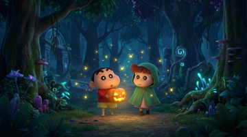 梦幻感3D卡通风,蜡笔小新与小红帽在萤火虫点缀的魔法森林中邂逅,南瓜灯照亮温馨趣味的万圣夜。
