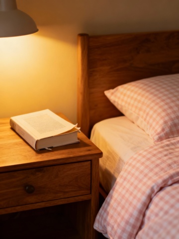 温馨静谧的卧室场景,柔和的暖黄色床头灯光线洒在熟睡的小女孩脸上,她身着白色背心,侧卧在床上,双手托腮,嘴角带着浅浅的微笑,盖着米白色的被子,床头有一个深色的圆形小床头柜,整体画面采用写实摄影风格,光影层次丰富,阴影自然柔和,色调以温暖的米黄与深蓝紫色暗调为主,营造出宁静、舒适、充满安全感的夜晚睡眠氛围,展现出卧室空间的温馨与安逸。