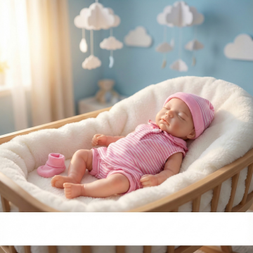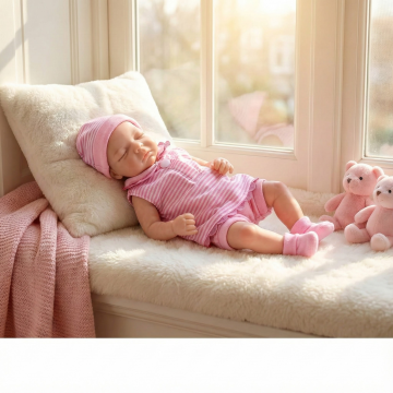 请生成一张一个欧美白人儿童抱着图中的毛绒玩偶(玩偶尺寸为25cm)躺在卧室的床上睡觉,抱着的玩偶和图中的玩偶一样