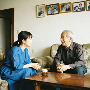 生成10张类似风格的场景图,年轻人帮老人按摩肩膀的温馨场景图,需要有桌子或者其他摆放产品