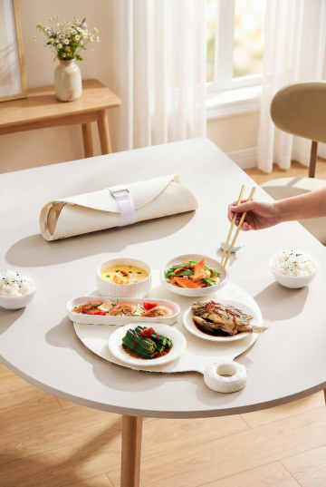 温馨生活场景:浅木色桌面+猫咪爪印餐垫,猫条包装斜向排列,搭配挖取餐勺与猫爪玩具,突出居家感