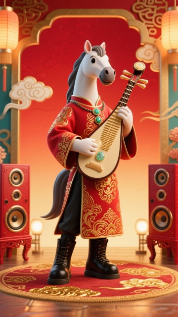 鎏金3D骏马踏金币,浮雕质感配祥云烟花,国潮风重拟物设计,喜庆梦幻尽显中式年味。