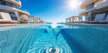 夏日白天泳池场景,清澈的蓝色泳池水,泳池小格子瓷砖。上方泳池水面上漂浮着一个白色圆形物体;下方物体下面形成一个向上吸水的漩涡特效。水面上方是泳池岸边,蓝蓝的天空,阳光明媚,整体画面融合奢华度假风与未来感元素,光影清晰、色彩饱和度高。10张。