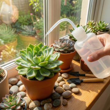 一系列6个不同的室内绿植及园艺元素的集合,每个元素独立展示,采用与原图一致的高细节3D渲染风格,柔和的米白色纯色背景,温暖的米色、浅棕色、淡黄色和白色为主色调,精确的光影效果,清晰的材质纹理。元素包括:1. 浅灰色陶土花盆中的多肉植物组合,叶片饱满有光泽,点缀小石子;2. 透明玻璃花瓶插着干枯的尤加利叶和白色小雏菊,瓶口系着浅棕色麻绳;3. 复古铜色浇水壶,壶嘴弯曲,壶身有细微划痕,壶内装有半壶清水;4. 编织篮筐里的常春藤,藤蔓自然垂落,叶片呈心形,颜色从深绿到浅绿渐变;5. 白色陶瓷小花盆里的薰衣草,紫色花穗饱满,叶片细长;6. 木质托盘上的三小盆不同种类的迷你绿植,托盘边缘有自然木纹。所有元素排布规整,大小统一,间距均匀,保持相同的光照方向和阴影效果,整体呈现简洁、温馨、自然的居家园艺氛围。