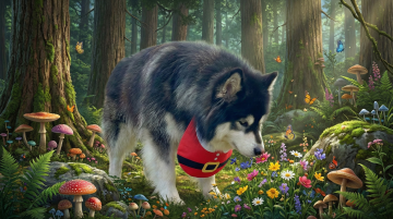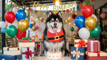 以图中的狗狗围兜为元素,狗狗戴上围兜,物体主体特征不变,设计6张跟狗狗围兜有关的图。比例 「16:9」