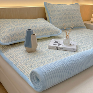 一张温馨的卧室场景,中央是一张铺着棕色床垫的床,床垫表面柔软舒适,带有自然的纹理。阳光透过窗户洒在床垫上,形成温暖的光斑。床头柜上摆放着一盏柔和的台灯和一盆绿色植物,整体色调温暖柔和,营造出舒适、放松的居家氛围。