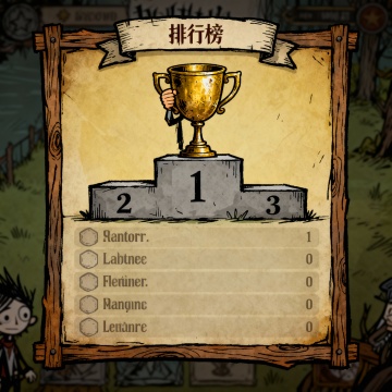 生成一个游戏排行榜弹窗,顶部有颁奖台一二三名和奖杯,饥荒绘图风格