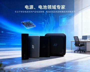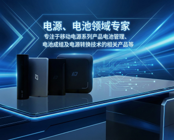 根据这张图,做一个网站动画图1280X560的,带广告内容为电源、电池领域专家 专注于移动电源系列产品电池管理、电池成组及电源转换技术的相关产品等。背景要科技办公场景