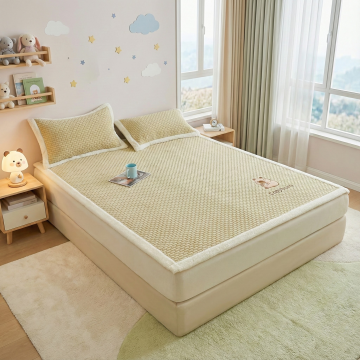 一张温馨的卧室场景,中央是一张铺着棕色床垫的床,床垫表面柔软舒适,带有自然的纹理。阳光透过窗户洒在床垫上,形成温暖的光斑。床头柜上摆放着一盏柔和的台灯和一盆绿色植物,整体色调温暖柔和,营造出舒适、放松的居家氛围。