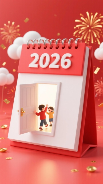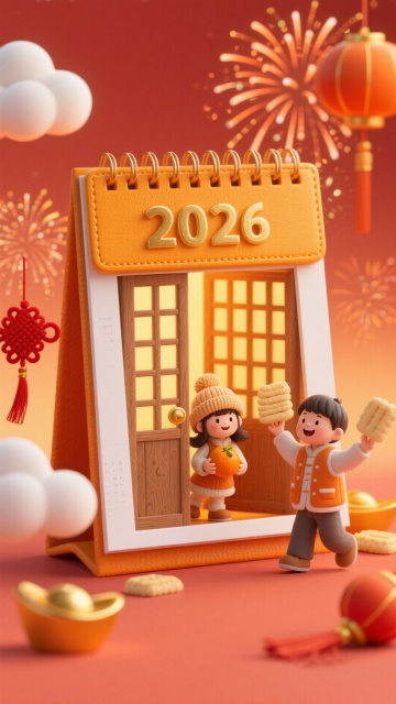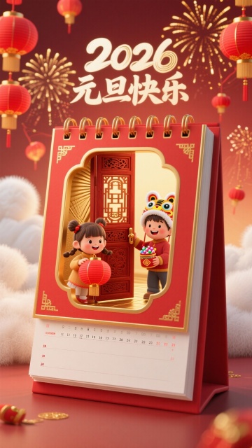 软3D国潮风日历,喜庆红金配色,融合灯笼、福字与摇马,塑料质感萌趣十足,传递新年祥瑞氛围。