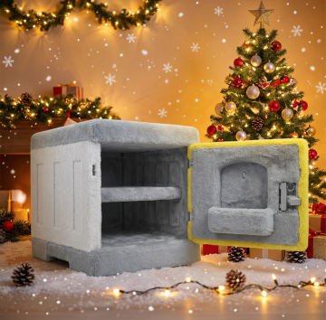 3D轻拟物风格,塑料质感暖风机置于雪景小镇,融合温馨梦幻的圣诞氛围,简约设计传递舒适感,虚拟现实场景呈现节日温暖。