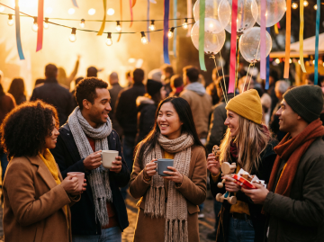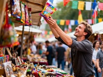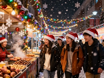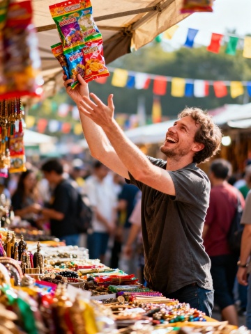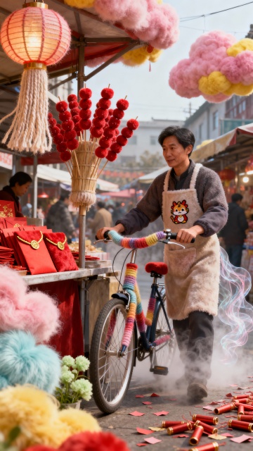 国潮风市集,毛发生长风装饰的自行车与梦幻粒子飘动,喜庆红灯笼与卡通虎纹围裙交织中式感,轻拟物风呈现节日欢乐氛围。