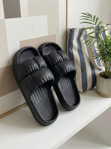 保持原图主体不变,更改背景,一双简约的拖鞋摆放在时尚的室内场景中,背景可能是简约的现代家居或艺术墙,搭配休闲单品如帆布包或鸭舌帽,展现时尚休闲感,图片比例是3:4,分别生成10张拖鞋摆放姿势不同的图片