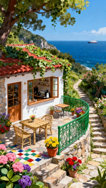 手绘,插画,动漫,夏日。闽南建筑,厝,双层的厝,多层的闽南骑楼,闽南建筑群,多层建筑体,南洋风建筑,闽南建筑综合体,台阶,建立在岛上,椰树,草,植物,沙滩,周围都是海,孤岛,海鸥,码头,木船。厝的改造,现代的厝。浪漫的,黄昏。艺术,美术,灯塔,落日。