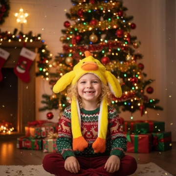 请生成一张一个欧美白人儿童坐在室内圣诞树旁的地毯上打开圣诞礼盒的盖子,图中的玩偶放在圣诞礼盒中,女孩表情惊喜