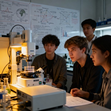 场景描述:在一个现代化的实验室里,几名年轻的科研人员正在紧张地工作。他们围绕着一台高科技设备,讨论着最新的实验数据。实验室的灯光柔和,墙上挂满了各种图表和公式,显示出浓厚的学术氛围。