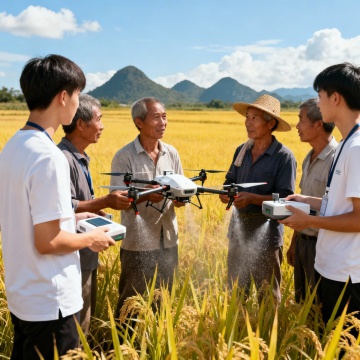 场景描述:在一片广袤的田野上,一群年轻的技术人员正在向农民讲解无人机喷洒农药的技术。农民们认真听讲,脸上洋溢着对新技术的期待。远处的山峦和蓝天白云构成了一幅美丽的田园画卷。