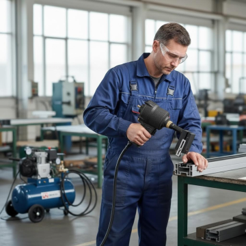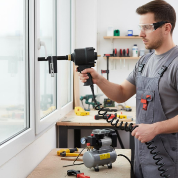 将这个机器置入一个工具加工桌面 可以是这个机器正在给铝制窗框打孔 只能打很薄的铝材或者钢材 有工业感景深效果 保持机器不要变形不要改变细节 生成四张