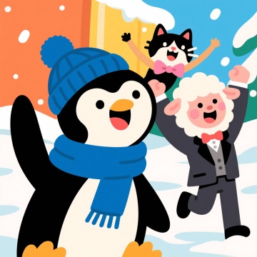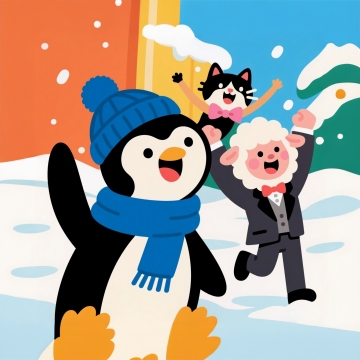 画面中心1只企鹅,1只猫咪,1只绵羊,表情可爱欢乐,企鹅戴着蓝色毛线帽子和围巾,绵羊穿着绅士西服,猫咪戴着粉色蝴蝶结,背景是雪景,他们欢呼雀跃,表情夸张
