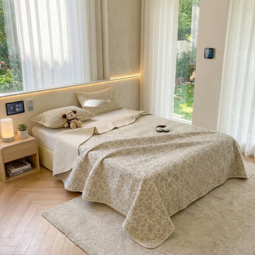 不改变图中床品所有细节 生成现代清新温馨卧室场景