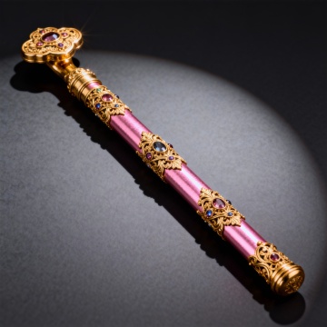 背景是森林中一块灰黑色的石头上,一支手电筒的特写,被包裹在一股泼溅的水中(从地面泼溅而起,激起水花,水花晶莹剔透,折射着光线)