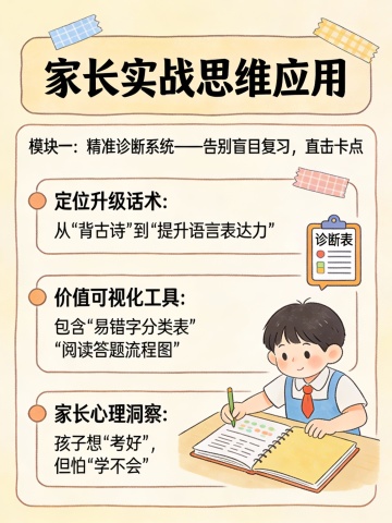 三个时间格:0-5分钟(练规范书写)、5-10分钟(孩子讲题)、10-15分钟(击掌鼓励);配钟表、铅笔、笑脸表情,强调“短时高效”。