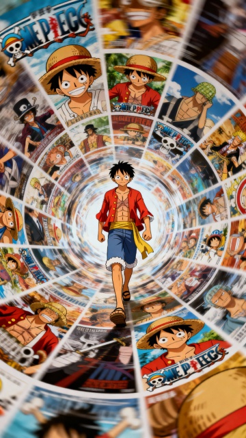 画面中有许多经典海贼王路飞面呈螺旋状排列,主人公路飞在旋转的海报中行走。固定聚焦在他身上,周围呈现朦胧模糊、涂抹、拖影的效果。