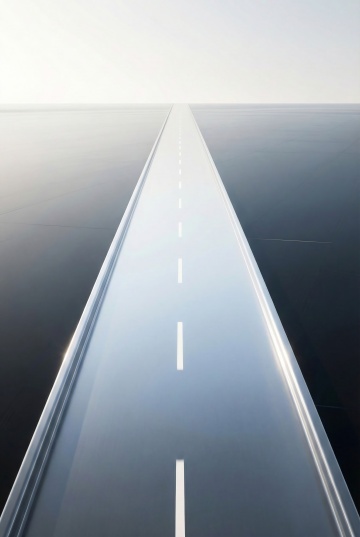 一张纵向构图的沥青路面特写,黑色路面具有细腻的颗粒质感,中央有一条由等距分布的短白色虚线组成的分隔线,两侧边缘各有一条连续的明亮黄色实线,路面上散布着少量细小的白色斑点,整体呈现出简洁、规整且具有重复性图案的视觉效果,色调以黑白黄三色为主,形成强烈的色彩对比和清晰的线条结构。