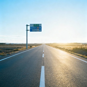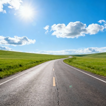 清晨阳光照射下的蜿蜒公路,路面为深灰色沥青材质,中央有双黄实线分隔,右侧边缘线为白色实线,道路向远方山谷中延伸并自然弯曲,两侧为茂密的绿色草地与低矮灌木丛,远处是起伏的绿色山丘,天空呈现从地平线处温暖橙黄色向顶部渐变至清澈蓝色的渐变效果,光线明亮柔和,在路面和草丛上形成清晰的明暗光影对比,整体画面呈现出宁静、开阔且充满希望的氛围,具有高度写实的摄影质感,细节丰富,色彩和谐自然。