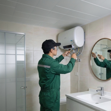 3D渲染风格浴室场景,主色调为纯净的白色与温暖的米色,搭配金色水龙头点缀,柔和的自然光从巨大的落地窗洒入,窗外是壮丽的雪山远景,光线在光滑的地面形成明亮的反光与柔和的阴影。画面中央是一个现代简约风格的白色浴缸,边缘搭着一条白色毛巾,金色水龙头正流出清澈的水。浴缸后方的米色立柱上安装着白色的热水器,下方壁龛内整齐摆放着折叠的白色毛巾和透明瓶身的洗护用品。整体氛围宁静、高端、充满自然光线与开阔视野,展现出极简主义的优雅与舒适。