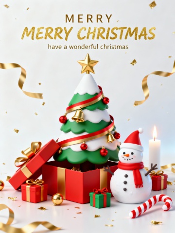 软3D风圣诞场景,粘土质感搭配鎏金元素,卡通雪人与圣诞树萌趣十足,喜庆氛围浓厚,节日祝福跃然纸上。