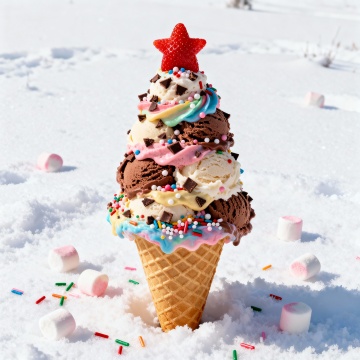 超现实主义风格的冰淇淋梦幻背景,广阔的浅蓝色天空中漂浮着蓬松的白色云朵,阳光明媚,光线明亮柔和,带有轻微的光晕效果。地面覆盖着厚厚的、如同棉花糖般柔软的白色“雪地”,质感轻盈蓬松。前景中,一个巨大的华夫饼冰淇淋蛋筒直立在“雪地”上,蛋筒呈金黄色,表面有清晰的网格纹理,顶部堆叠着粉色和白色相间的螺旋状冰淇淋,顶部是尖尖的粉色奶油,边缘有细腻的奶油质感。周围散落着多个彩色的冰淇淋球,包括一个彩虹条纹的圆形冰淇淋球在前景的“雪地”上。背景中,多个不同口味和装饰的冰淇淋蛋筒漂浮在空中,有的顶部有彩色糖屑,有的是纯蓝色或白色冰淇淋,它们大小不一,分布在画面的不同深度,营造出层次感和梦幻般的空间感。整体色调以蓝、白、粉为主,色彩鲜艳明快,充满童趣和甜蜜的氛围,细节丰富,材质表现细腻,光影过渡自然,呈现出高饱和度、高清晰度的视觉效果。