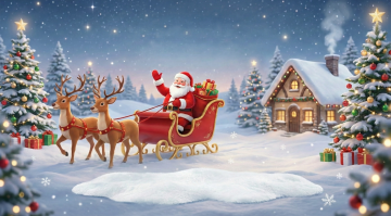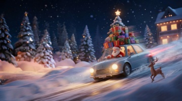 梦幻感与喜庆感交织,3D风与插画风融合,圣诞老人驾着鎏金雪橇飞越灯火璀璨的小镇,粒子光效洒落,营造温馨卡通氛围,尽显节日浪漫。